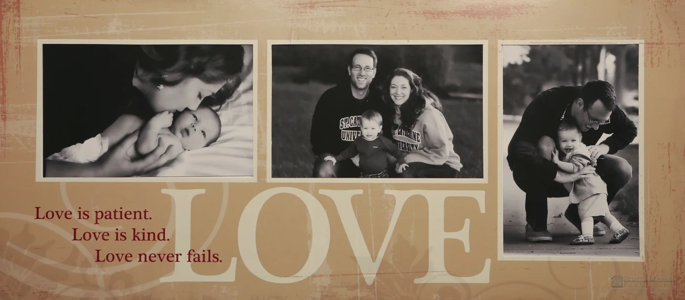 Yesterday's black and white architectural photo was a bit cold and abstract. So how about something different? My assignment for these photos was to find something that would work in this template, which came with a frame Katie and Brian had. I have Deb to thank for the concept: one of Katie and Glenyce, one of the whole family and one of Brian and GJ.