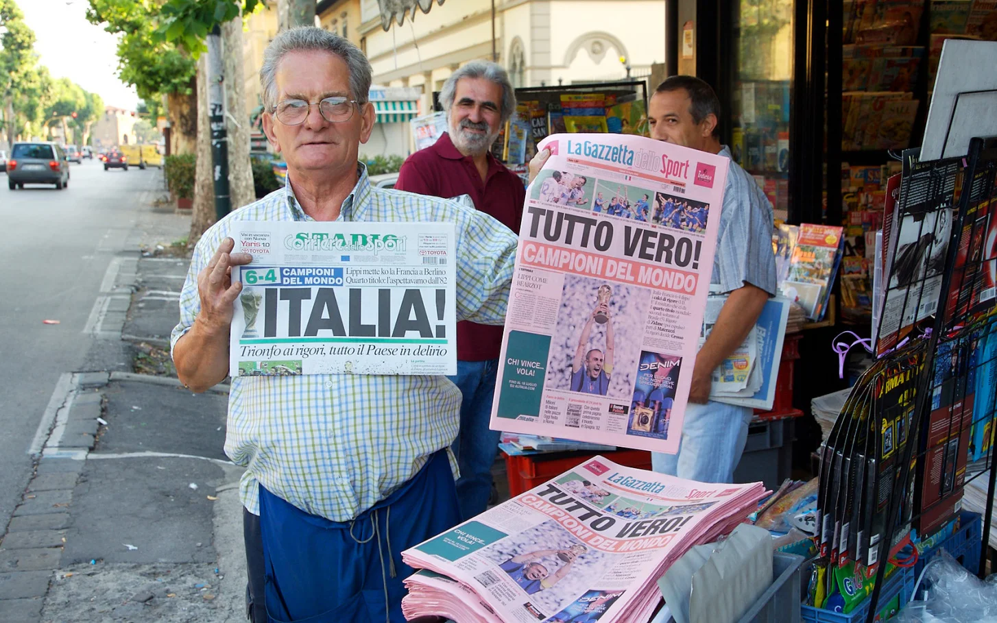 Around the corner from our hotel entrance, I found a newsstand loaded with papers proudly proclaiming the Italian victory. I don't speak Italian but I signalled that I wanted a photo and this was the pose that the news vendor struck. "Tutto Vero!" means "all true!" "Campioni del mondo" means "Champions of the World." Italians are passionate people but they are especially passionate when it comes to World Cup Soccer.